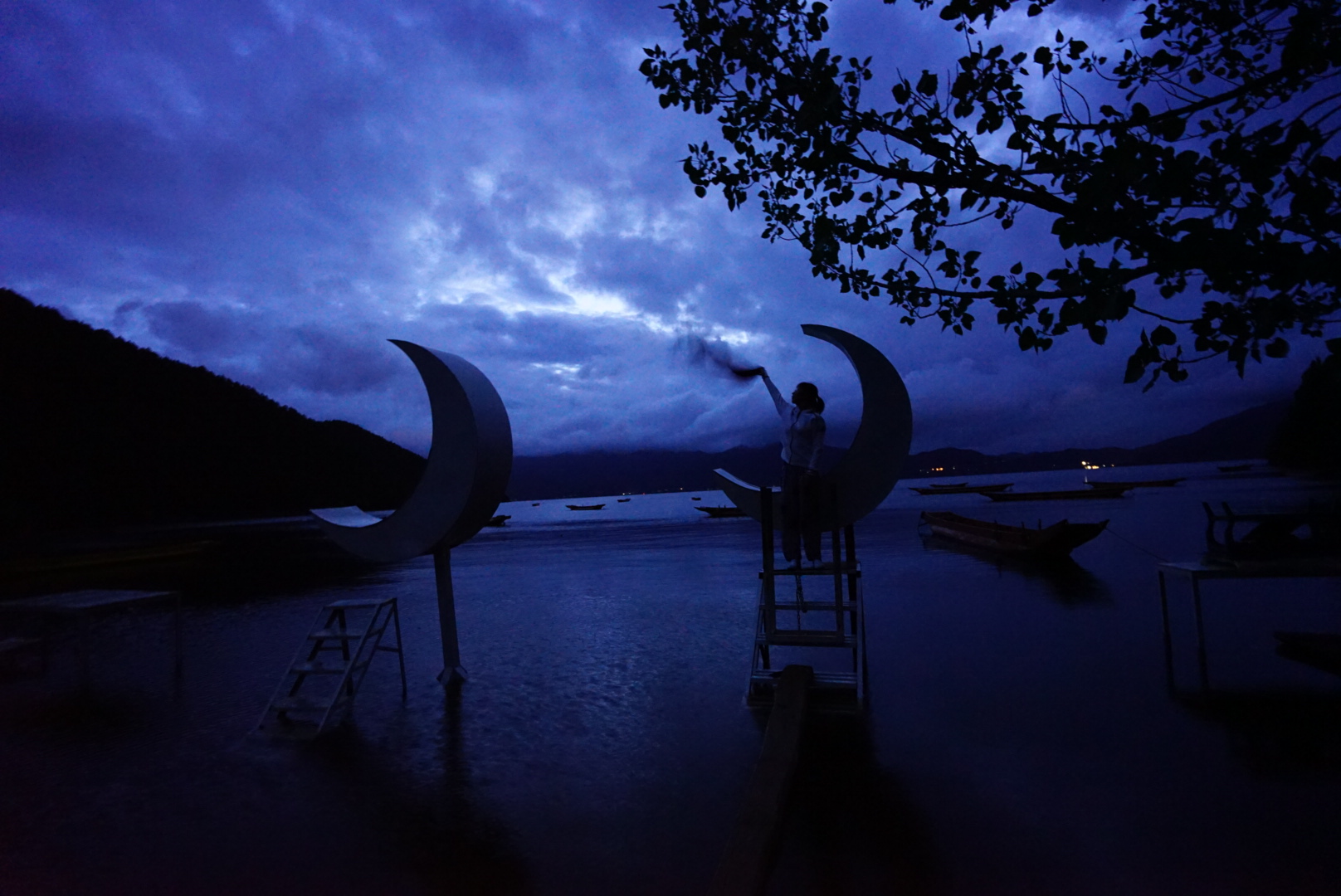 等到女神湾天已全黑,路也很泥泞,我们打着手机的灯光走下去,进入女神的怀抱。夜色下,湖面停泊着很多船,仿佛还有未归人,也许就是我们了。