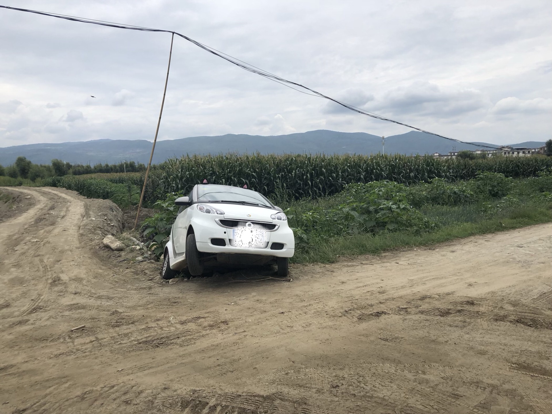 因为路小、颠簸,跟着导航进了一条死路,倒车时在我妹的”姐姐,没事,倒”的话语中不知不知觉倒进了田坎里一开始我们以为只是个小坑坑,我妹非常勇敢的下车打算靠自己把车推上去,下车后,傻眼了,车子的后车轮已经悬空,无奈我只有相当艰难的从前车窗爬了出来~