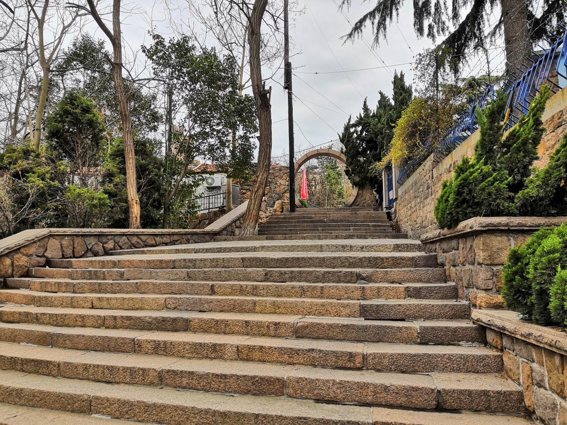 黄岛路共分为三段,从四方路至芝罘路一段,是缓坡马路;从芝罘路到安徽路一段是石阶路,不能行车;从安徽路至平原路一段虽是柏油马路。黄岛路中段的石阶路,在岛城独具特色,与前面提到的“马牙石”不同,这里的石阶路用的是大石板。↓