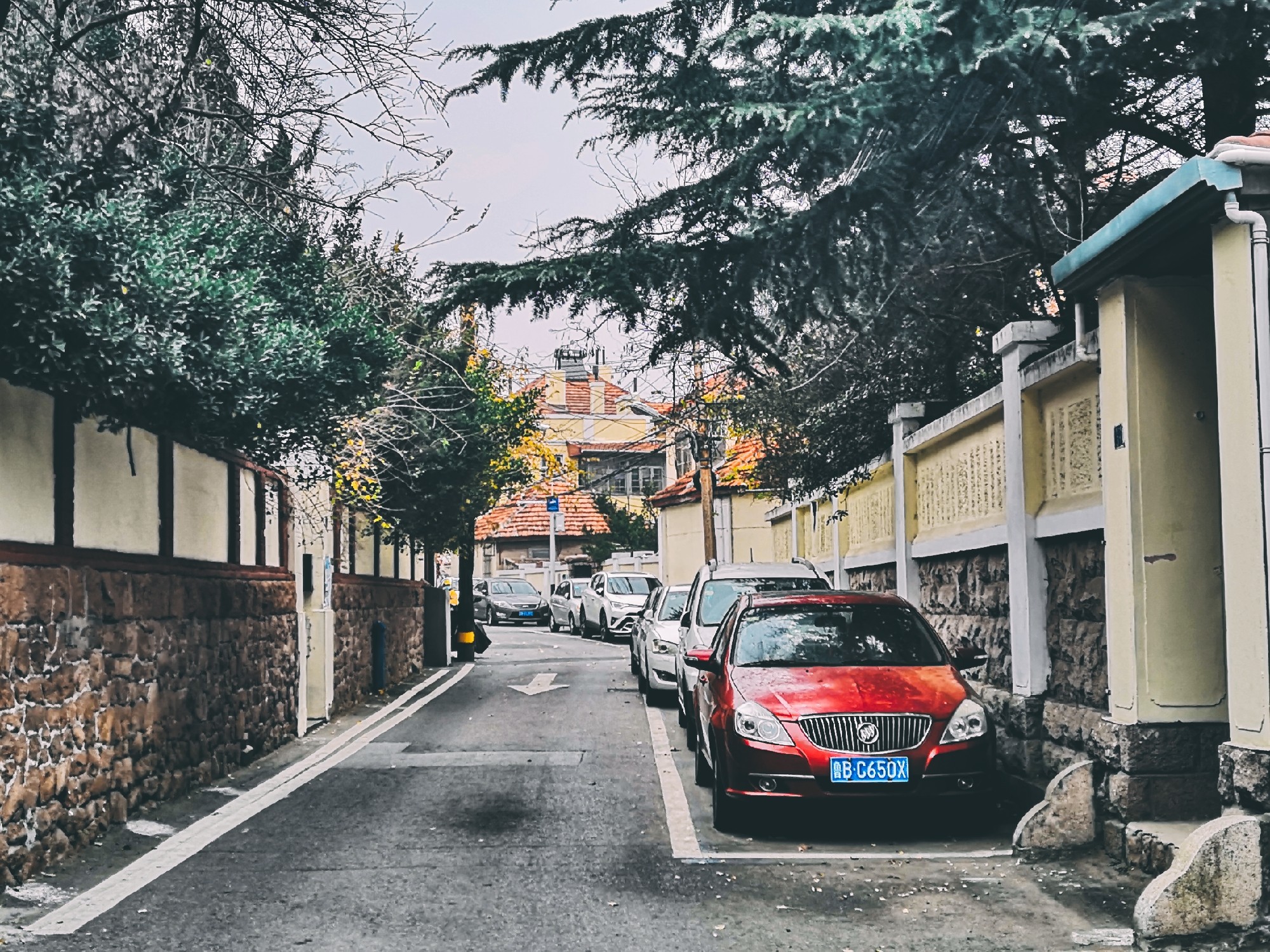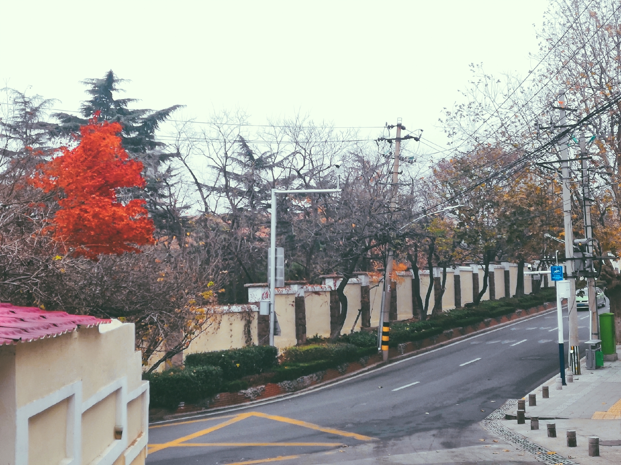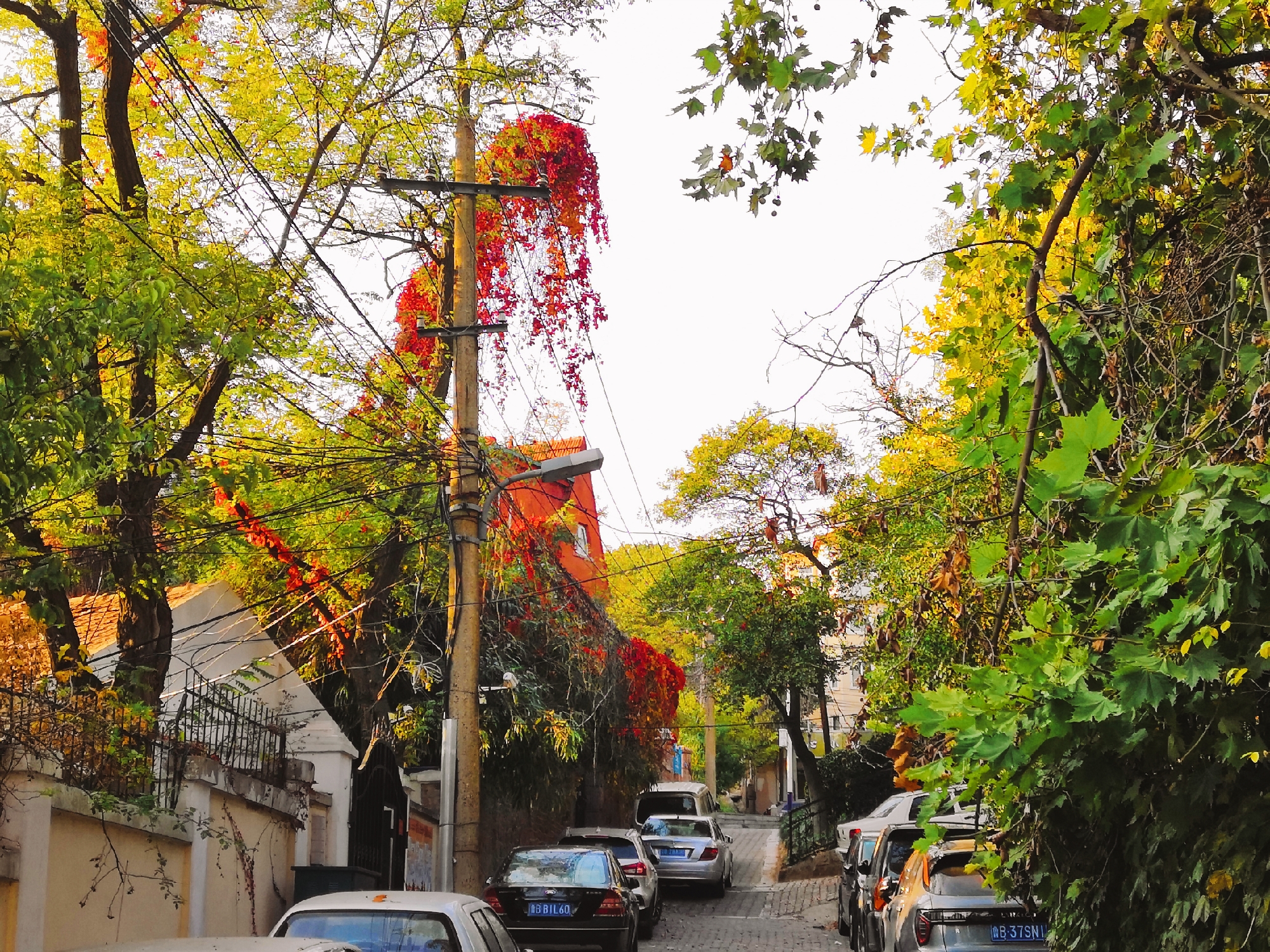 沿着鱼山路直行就到达网红角了,这里是鱼山路、大学路的交汇处,红墙在青岛算是个稀罕物,所以吸引了大量的眼球