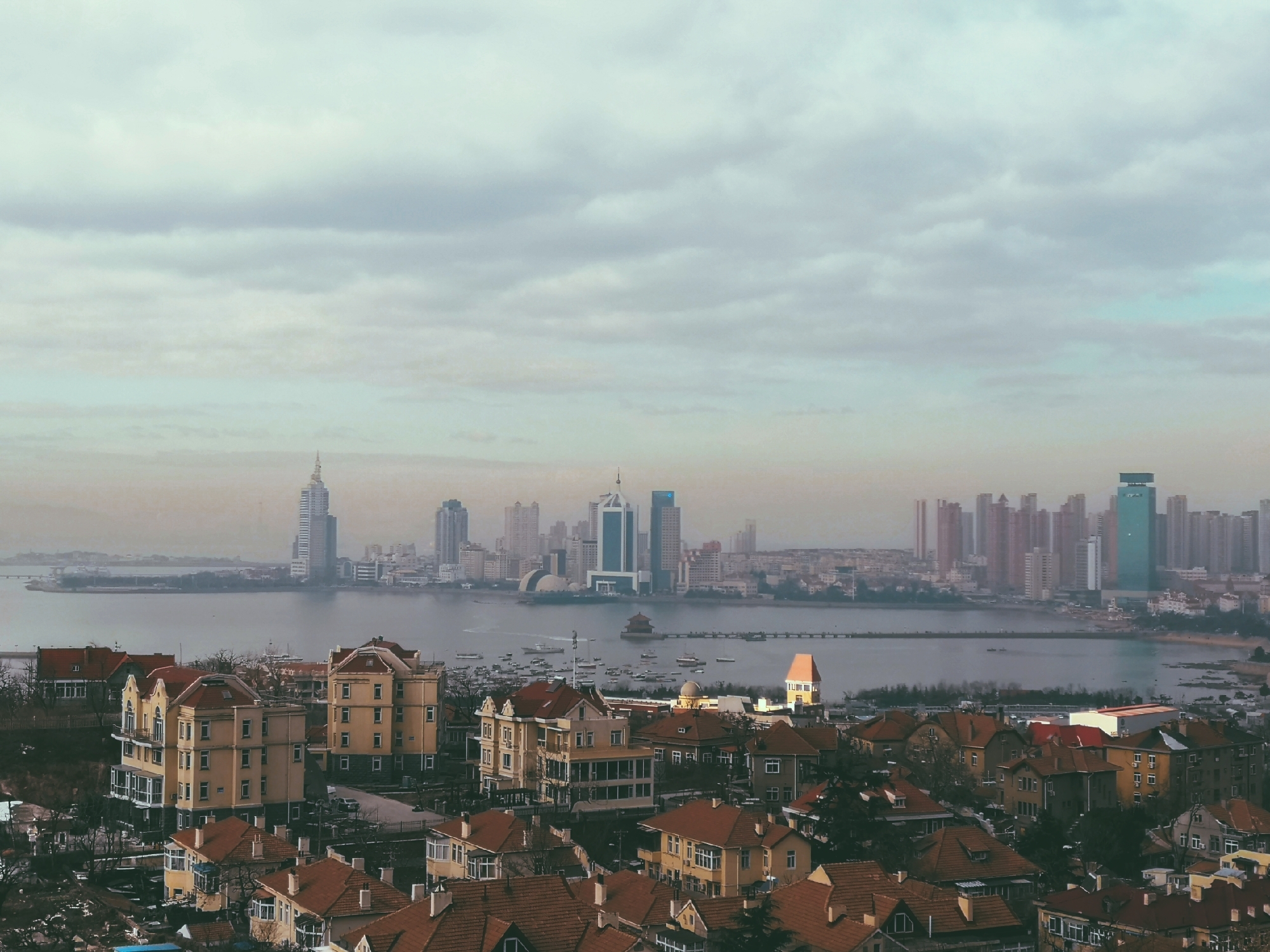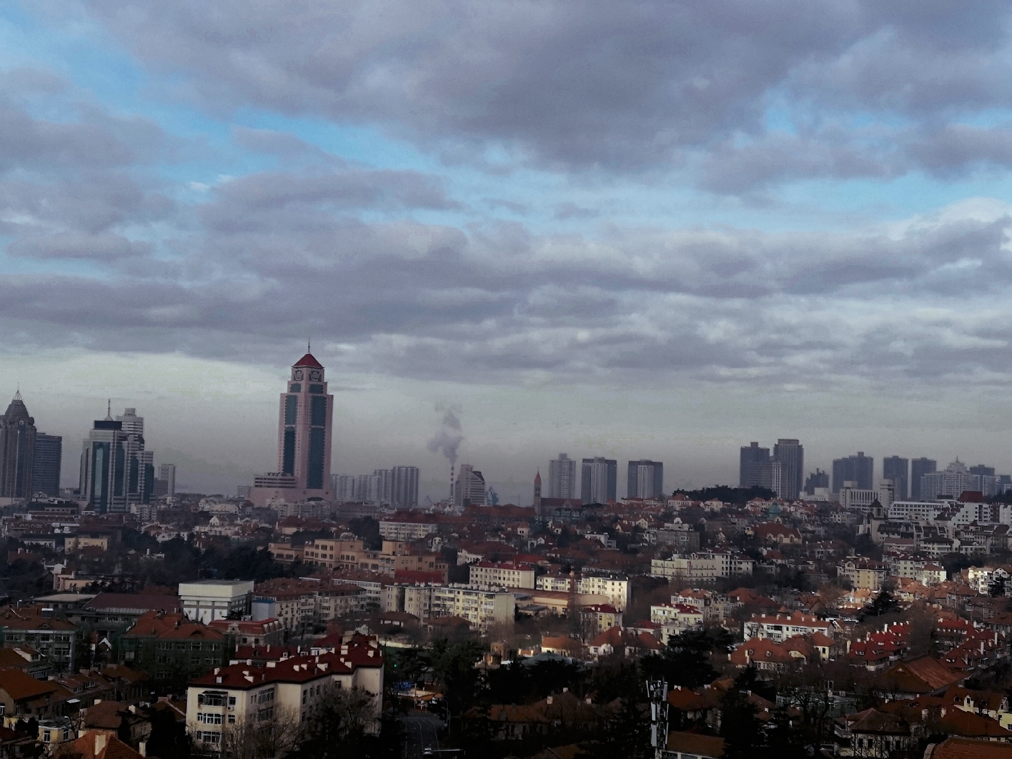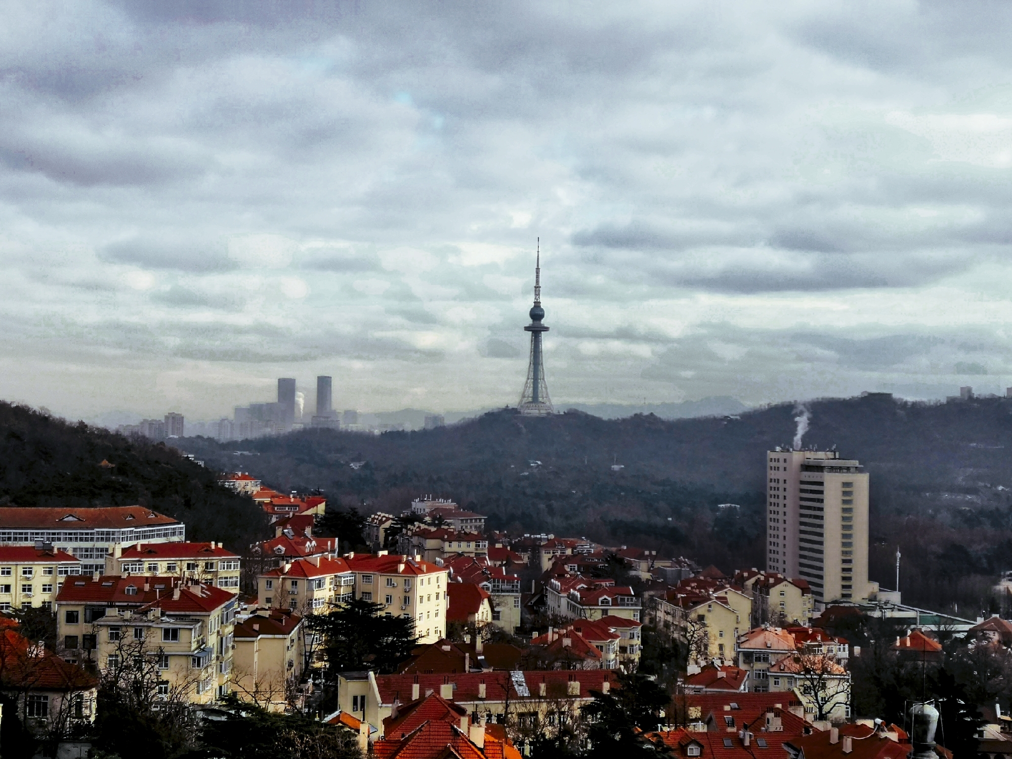在信号山上俯瞰江苏路教堂,这是前期拍摄的照片,天气晴朗的时候可以看到黄岛的建筑↑