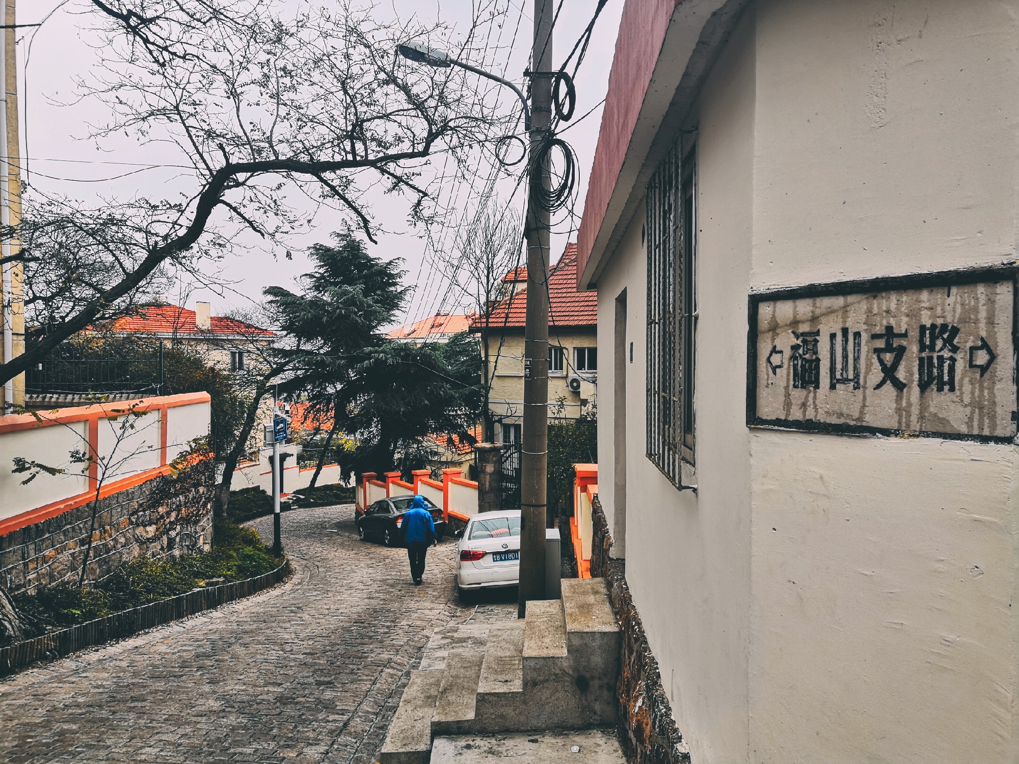 福山支路上铺满了“马牙石”,道路弯弯曲曲,这些石头路其实是后来修复的,整条路都可以行车,能从文登路路口把车一直开到小鱼山公园