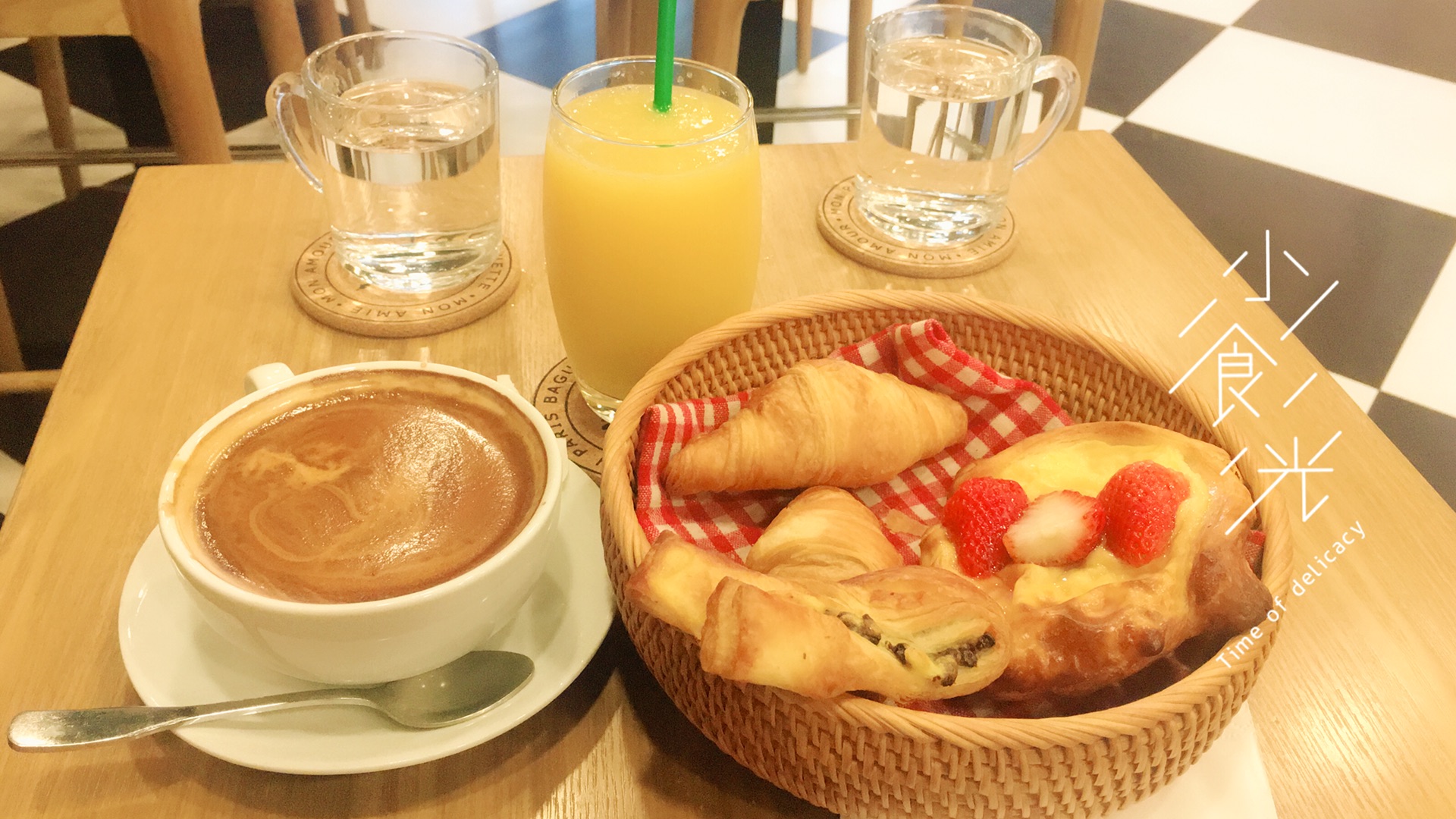 牛角包应该是店里的招牌吧,有分正常size和迷你的,我们点了两个迷你的牛角包,一个草莓塔,以及两杯喝的。小哥哥看我们在拍照,又送了我们一个起司什么的。