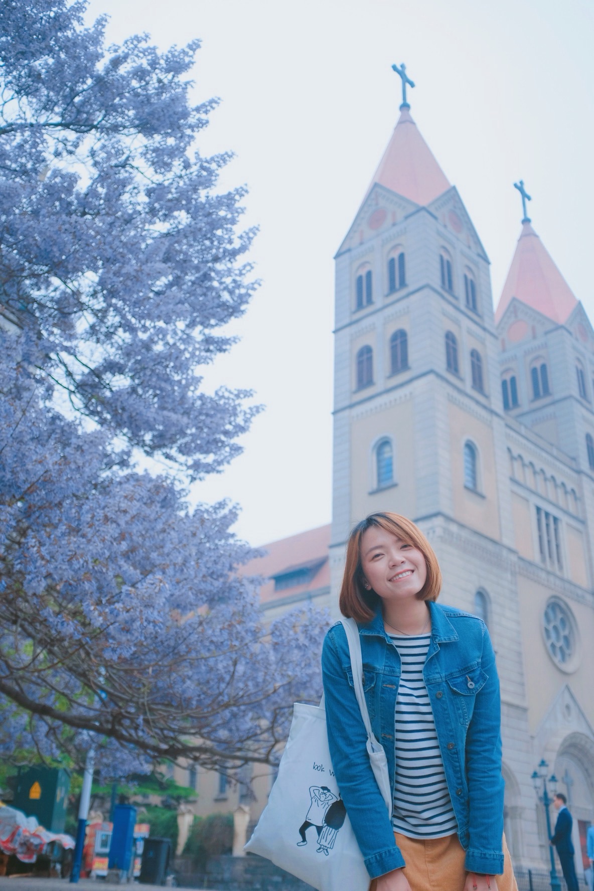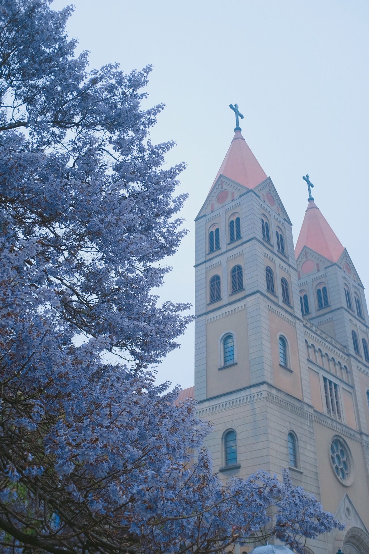 教堂外面这一大棵的泡桐盛放,真的太美了,趁的教堂也更加好看了。