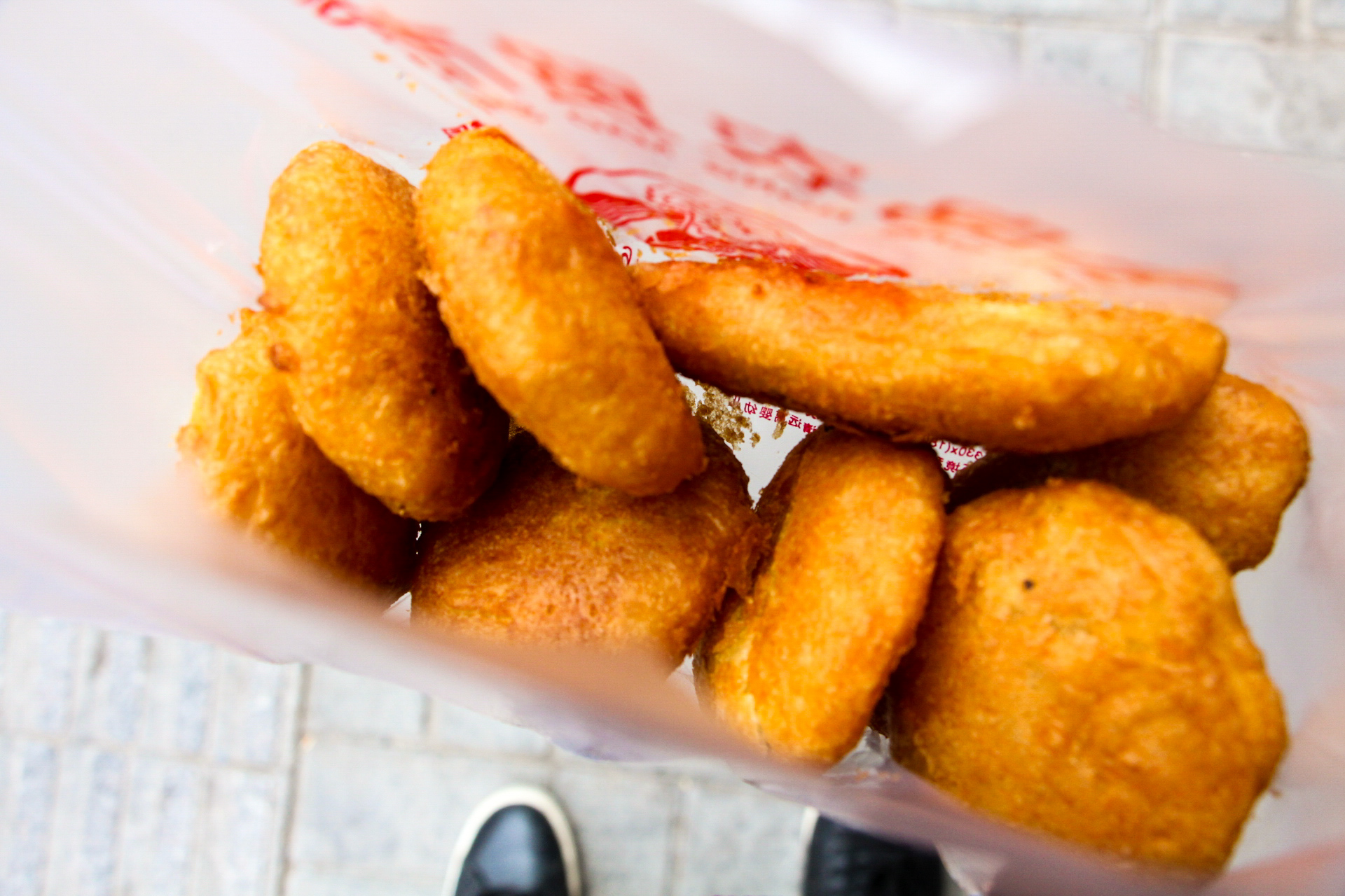 来买的大多是周围的老顾客,十几二十个装了满袋,价格是1.5两个,要注意的是就算烫着也不可冷吃,冷了之后酥脆不见,油味被无限放大,糖汁浸在皮里,完全不是一个味道了。