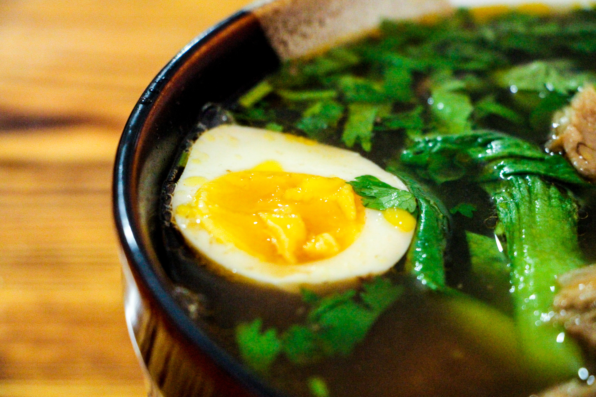 面上桌,小碗也有16cm+,女孩子吃一碗足够了。牛腩量比较多,两颗小青菜,半颗溏心蛋,汤上浮一点黄色油花,是炖牛肉特有的。喝口汤,味道是有点家常炖牛腩的感觉,微甜偏咸,牛腩不算肥,所以没有完全炖烂不过还挺好咬。面是自制的那种感觉。我更喜欢吃拌面,所以对这里感觉还好,不过这样满满的一碗下肚还是满足的!